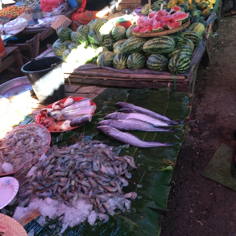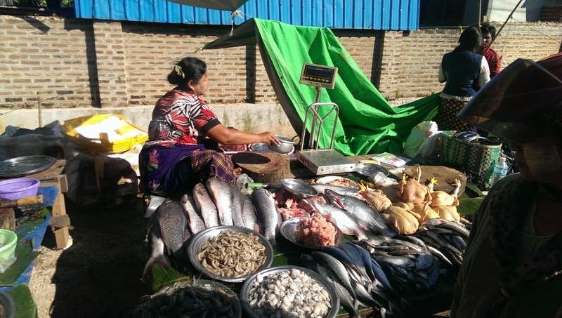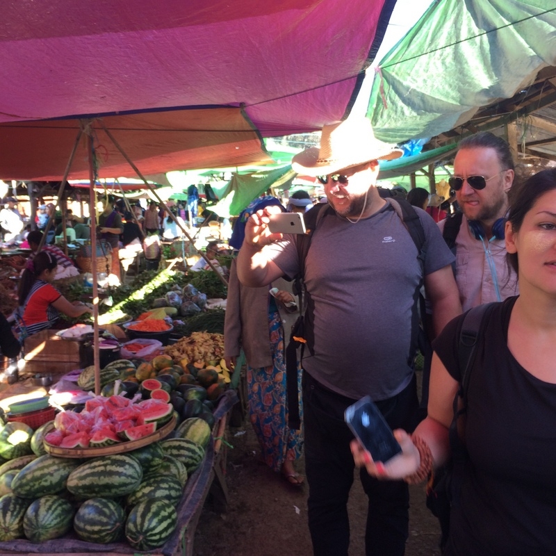 W okolicach Inle codziennie odbywa się targ w innej okolicznej miejscowości. Ludzie gór schodzą do miasteczka, żeby sprzedać swoje uprawy, które wyglądają świeżo i pysznie. A jeszcze lepiej pachną ! Borek jak zwykle miał przeprawę przy stoisku z suszonymi rybkami. A potem w drogę. Pierwszy dzień treningu – przed nami 16 km.